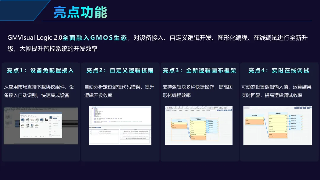GMVisual Logic 2.0:实现协议组件开发效率的飞跃。支持设备免配置接入、逻辑自动校错、画布自动整理、协议组件开发与在线调试等功能,结合全程可视化操作与配套教学视频,助力开发者快速掌握复杂任务,显著提升开发效率。