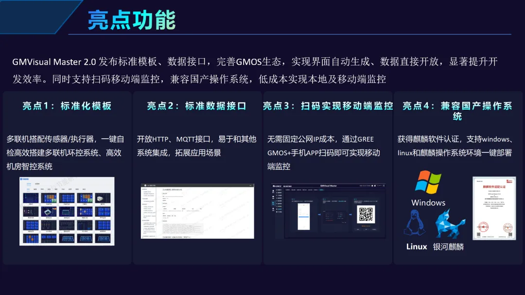 GMVisual Master 2.0:精准锚定核心场景。支持高效机房系统与多联机环控系统的一键搭建,轻松实现移动端扫码监控,并具备与第三方系统的无缝对接能力,确保数据高效流通。