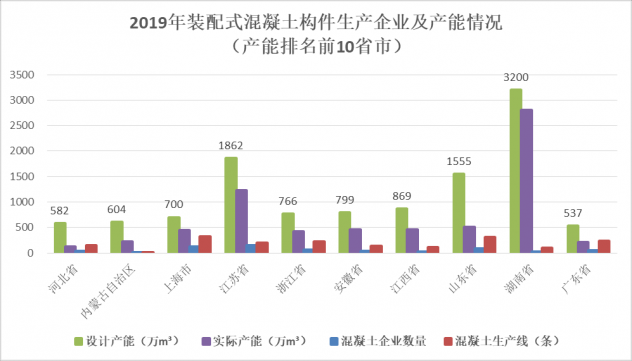 图5 2019年装配式混凝土构件生产企业及产能情况(产能排名前10省市)